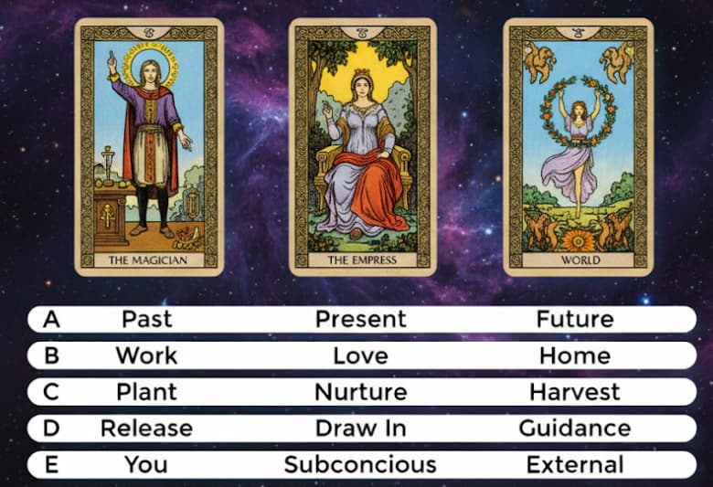 The three-card spread I use most goes like this: current situation, obstacle, then outcome. Pretty straightforward.