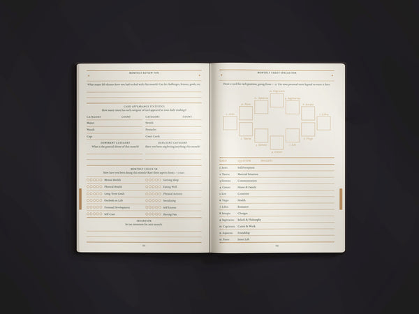 This one leans into a planner-style format with tarot-specific sections, giving you structured spots for daily/weekly spreads, card positions, and prompts, but with extra roomy layouts and open pages to write as much as you want.