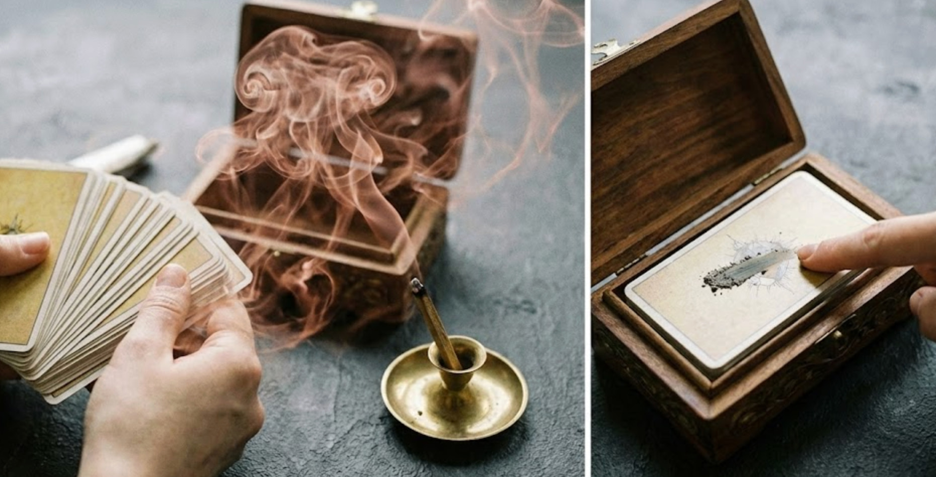 If you prefer smoke cleansing but want to move away from white sage (for cultural reasons or personal preference), you can try dragon’s blood incense. After passing the fanned cards through the smoke slowly, place the deck in its box and smear a little bit of incense ash across the top card before closing it.