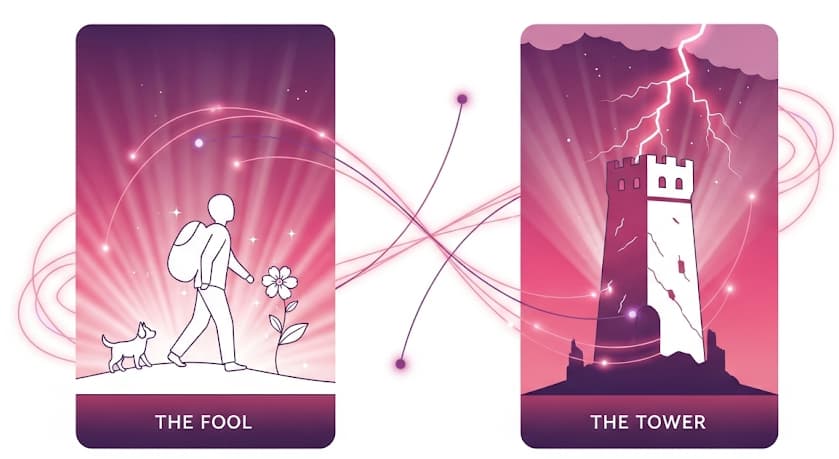 Most people get The Tower and panic. They see destruction, chaos, their carefully built life crumbling. But paired with The Fool, this combination recognizes something unique in you, your ability to find freedom when everything falls apart.