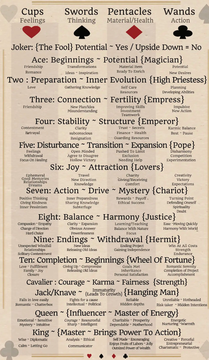 I know I’ve been cluttering the forum this week with my threads on different Cartomancy card meanings (sorry for that!), but that way you can look up the meaning for each individual card meaning (also working on a quick tool that will do your reading for you - I’ll link it here tomorrow).
