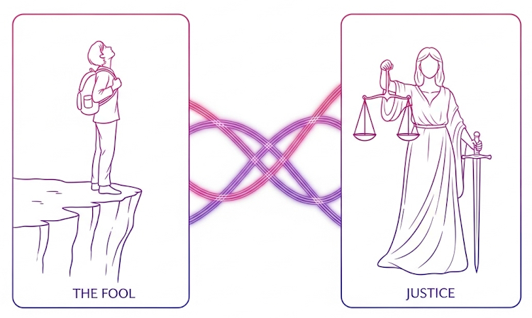 Your particular experience, with all its unexpected turns, follows a higher order. The seemingly random chances you take (Fool) are guided by a cosmic justice system that knows exactly what experiences you need. You’re not just lucky. You’re aligned.